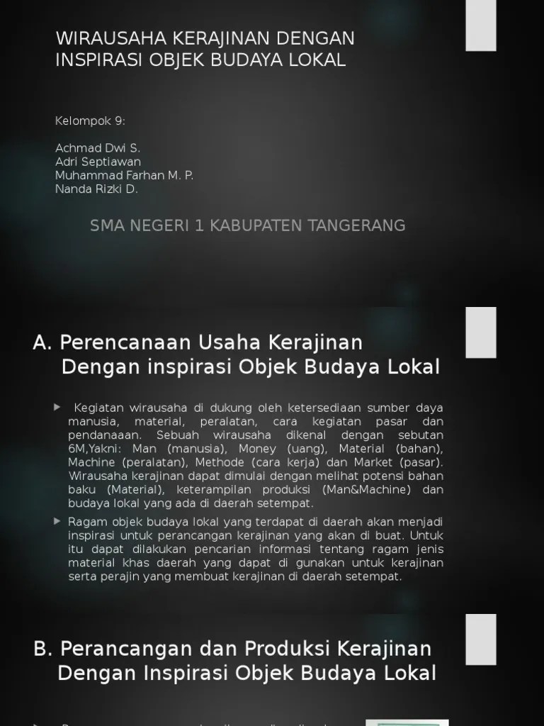 Pemilihan material juga akan disesuaikan dengan identitas atau merk produk. Ide, aksi, dan hasil karya. Pencarian ide produk 2.membuat gambar/sketsa 3.pilih ide terbaik Ide kerajinan dengan inspirasi objek budaya lokal akan dikembangkan menjadi produk kerajinan yang akan diproduksi dan siap dijual. Sumber daya yang dikelola dalam sebuah wperencanaan usaha kerajinan dengan inspirasi objek budaya lokalirausaha dikenal dengan sebutan 6m, . Daya tarik dan karakteristik dapat ditampilkan selain bahan kemasan, bukan hanya itu . Wirausaha kerajinan dengan inspirasi objek budaya lokal. Bahan bakumaterial ragam teknik contoh bentuk berupa foto . Itu dapat dilakukan pencarian informasi tentang ragam jenis material khas. Kerajinan dengan inspirasi budaya lokal adalah salah satu jenis kerajinan yang memfokuskan pada kerajinan yang idenya berasal dari budaya . Identiikasi ragam material dan teknik di lingkungan sekitar no. Anyaman dulunya merupakan teknik yang banyak digunakan karena memang kondisinya saat itu belum banyak media dan alat seperti mesin jahit. Prakarya dan kewirausahaan 7 lk 2.
