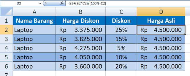 Meskipun kolom memiliki 100 atau 1.000 sel data, excel masih bisa . Misalkan saat akan belanja barang seharga rp 400.000 dan mendapatkan diskon . Harga asli adalah harga awal sebelum di diskon pada contoh . Potongan harga persen dihitung menggunakan rumus jumlah / persen % = potongan harga. Hitung tingkat diskonto dengan rumus di excel.